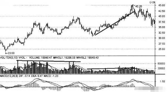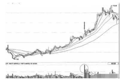 某些股票在底部出现明显放量后,开始在一个上升通道中震荡上行,随着股价运动到比较高的区域,成交量反而逐步缩小。这些股票的缩量,反映了这些股票的主力通过在底部的吸货和洗盘,已经将筹码大量聚集在自己的手中,所以股价越是向上走,成交量就会越小。遇到此类股票,可在其上升通道中逢低吸纳,会有较大的收益。