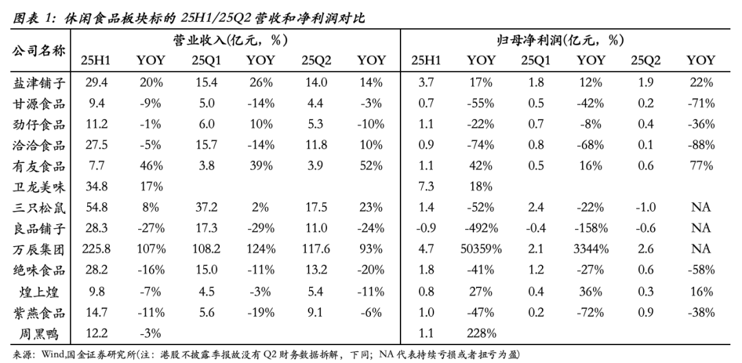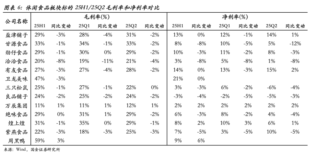但仍有部分企业受品类景气度下降及传统渠道人流下滑影响,上半年收入承压。如洽洽食品、甘源食品、劲仔食品25H1收入分别-5%/-9%/-1%。其中洽洽和甘源受传统优势渠道如商超、流通渠道下滑拖累较为明显,劲仔则受第二曲线鹌鹑蛋表现不及预期拖累。核心来看,新渠道红利已过增长最快阶段,优势品类挖潜和深耕为后续增长主要驱动力。