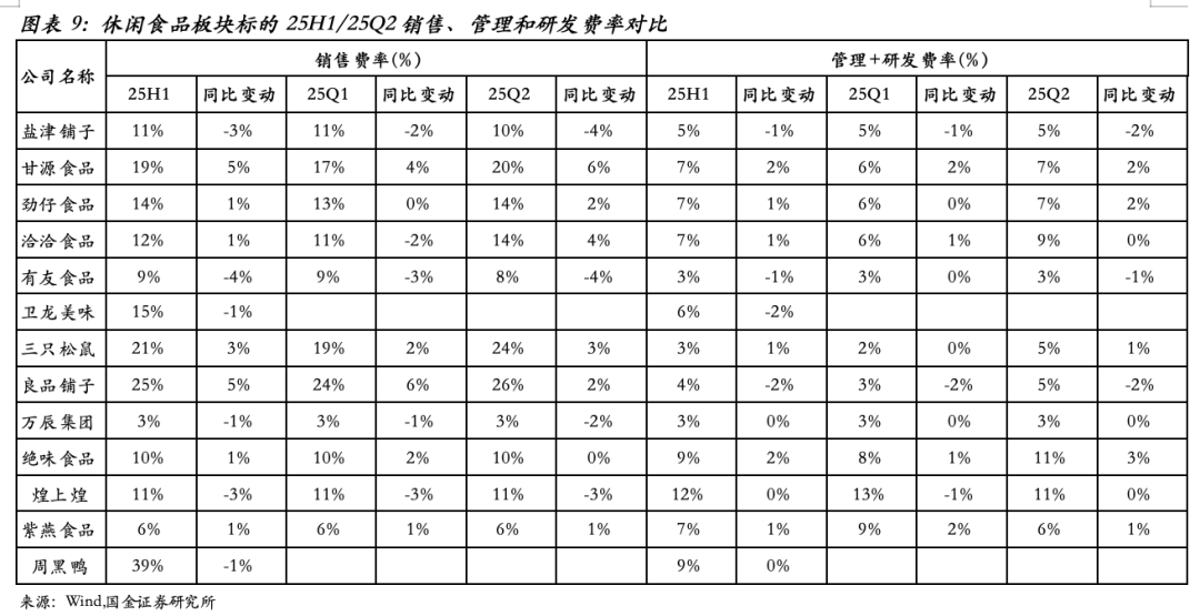 从费用端来看,25Q2销售淡季行业需求转弱,零食企业普遍加大广告宣传、会展活动等费用投放,盐津/甘源/劲仔/洽洽销售费率分别同比-4/+6/+2/+4pct。而管理及研发费率方面,多数公司延续降本增效策略,Q2同比普遍持平或略有下降,其中盐津费用控制效果明显,主要系公司主动优化电商渠道低毛利和代工产品,定量装等高毛利率渠道占比提升。