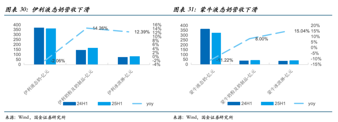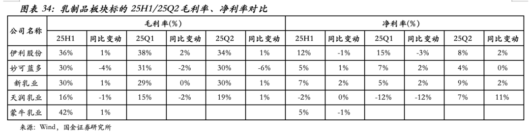 从费率端来看,行业内多数公司销售费率下降,主要原因系优化折扣促销、减少广告营销。分公司来看,伊利股份/蒙牛乳业/新乳业25H1销售费率分别为18%/28%/17%,分别同比-1pct/持平/持平。管理及研发费率各公司基本保持不变。其中蒙牛净利率下滑系上游相关产业链影响,因联营公司现代牧业主动淘汰低效牛只改善结构,以及原材料市场奶价下跌,导致上半年归属于股东净亏损9.1亿元,因此公司上半年归母净利润同比-16.37%。但从经营利润角度看,仍受益于原材料价格下降和公司主动优化费用管控,25H1同比提升13.4%。