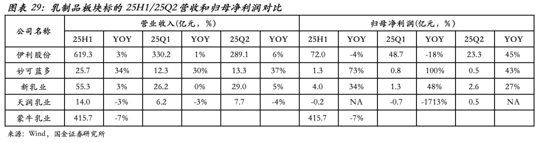 25H1乳制品整体需求偏弱,原奶阶段性供给过剩影响行业表现。龙头企业之间分化明显,部分公司凭借低温奶及新品类保持韧性。伊利股份/蒙牛乳业/新乳业/天润乳业25H1分别实现营收619.3/415.7/25.7/14.0亿元,同比+3%/-7%/+3%/-3%。其中伊利股份和新乳业在Q2收入端呈现边际改善趋势。