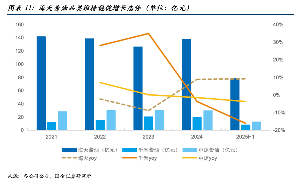 从龙头差异化的业绩表现来看,25Q2海天/中炬/千禾收入增速分别为+7%/-9%/-30%,我们认为海天持续逆势增长系: 1)市场增量挖掘:海天的渠道结构中BC占比更为均衡,改革思路更为灵活。公司深刻反思内部产品和渠道存在的问题,持续强化对于餐饮客户柔性定制需求的响应,同时加大力度挖掘C端碎片化渠道,实现B/C两方面的增量。2)产品矩阵差异:海天产品矩阵更加丰富,Q2从产品拆分开看,全品类(含蚝油、调味酱)基本实现双位数增长。而千禾和中炬主要依赖优势大单品酱油,但目前酱油市场逐步趋于饱和,市场竞争加剧背景下,持续提升市占率难度较大。3)经营能力差异:海天作为调味品赛道龙头,与第二名收入拉开显著差距,系公司内部激励机制有效、管理层对于市场需求感知度强且变革效率快,因此公司品牌、渠道力持续巩固。相较于中炬和千禾,今年半年分别有管理层换届、食品安全事件扰动,海天整体发展路径更为稳健。