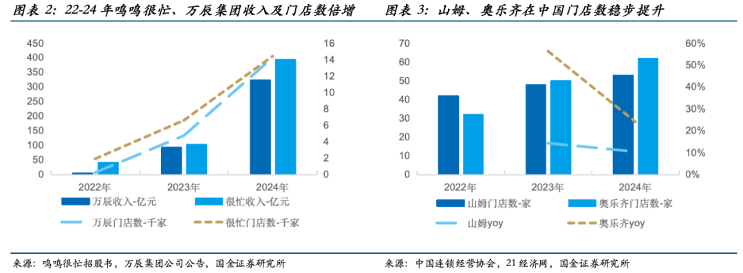 从渠道表现来看,流量逐步向具备便利性、性价比、多元选择的渠道转移。1)天猫、京东、抖音、拼多多、O2O到家等持续瓜分线上流量,流量竞争越演越烈,相关费用持续攀升。2)线下商超人流持续下滑,部分流通渠道受损明显,但新兴会员商超、零食专营、CVS等业态持续发力。如量贩零食龙头鸣鸣很忙24年门店数量超14394家,25年仍在持续开店。山姆会员店22年底约40家,24年底开设至53家。
