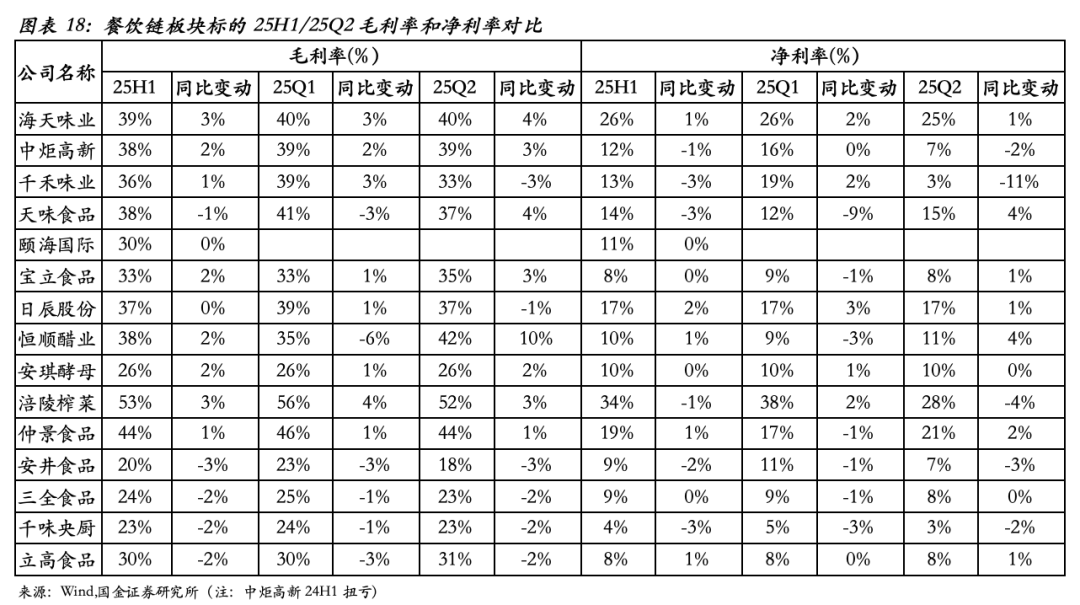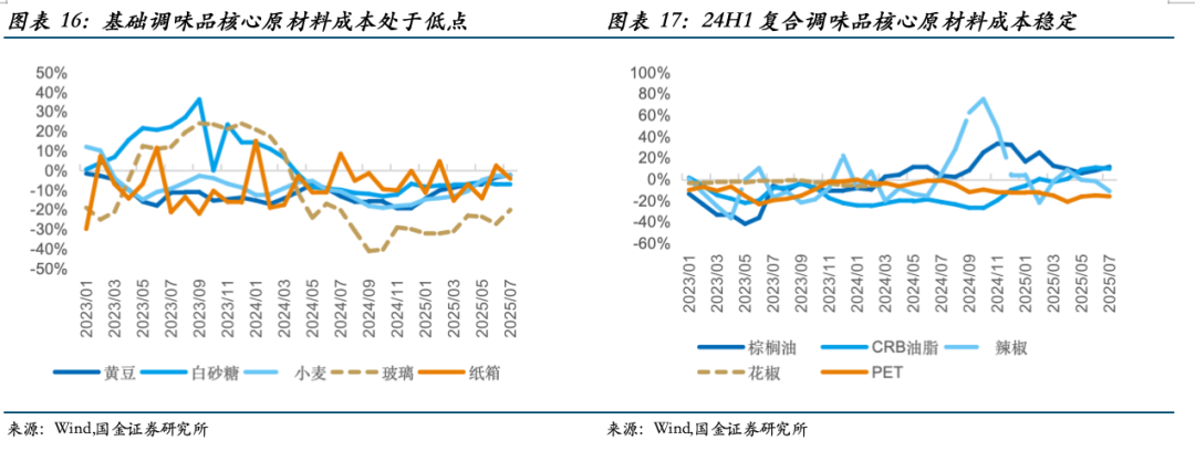1、基础调味品:自23年初各项原材料价格逐步回落,但酿造周期因素导致毛利率延迟反馈,25H1报表端全面享受原材料下行红利。25H1海天/中炬/千禾/恒顺毛利率分别为39%/38%/36%/38%,分别同比+3pct/+2pct/+1pct/+2pct。
