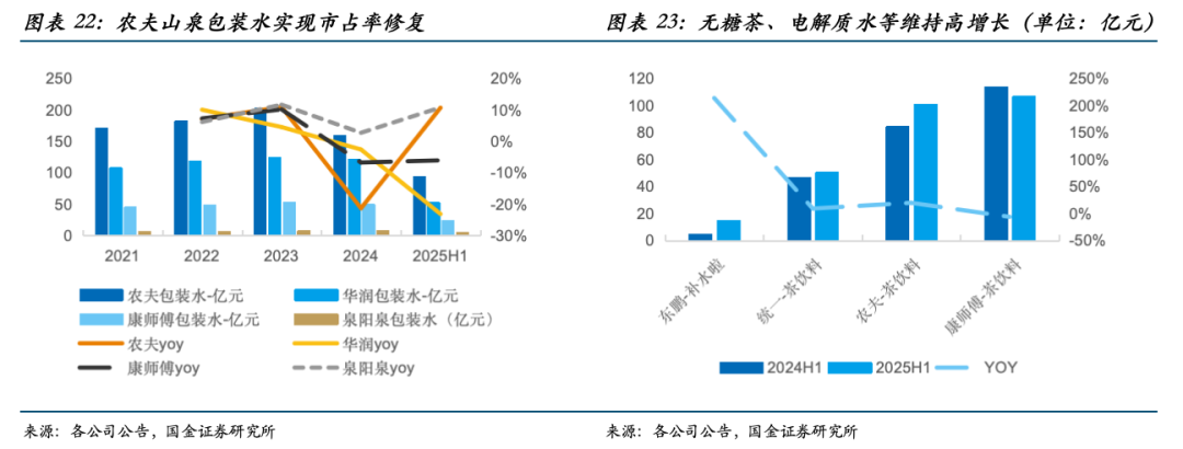 随着大众健康意识提升,软饮料低糖/无糖化趋势逐步明确,无糖茶品类实现快速增长。据欧睿数据显示,茶饮料自2021年开始恢复增长态势,并呈现加速增长态势。农夫山泉/康师傅/统一企业中国25H1茶饮料规模分别为100.9/106.7/50.7亿元,增速分别为+19.7%/-6.3%/+9.0%,其中无糖茶为增长核心驱动力,有糖茶受现制茶饮竞争略有承压。