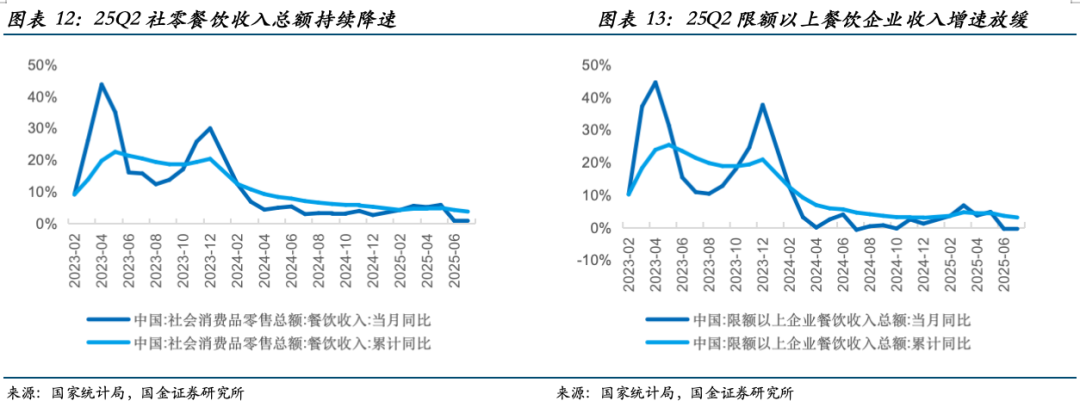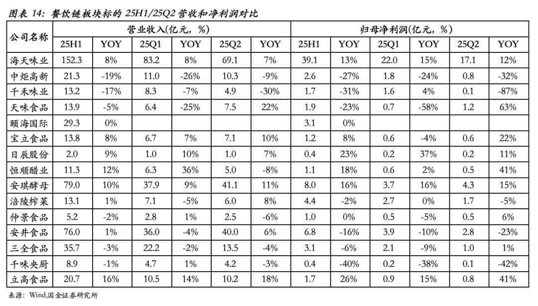 餐饮链:1)基础调味品:餐饮大盘需求疲软、居民端结构升级速度放缓,25Q2海天/中炬/千禾收入增速分别为+7%/-9%/-30%,海天稳健增长系积极拓展渠道和产品增量。酵母Q2收入/业绩同比+11%/+15%,成本下行业绩弹性兑现。2)复合调味品:复调表现优于基调,但内部仍有分化。C端需求稳健,B端表现分化,系各家挖潜新客户能力差异,其中定制餐调企业通过提供新的解决方案保持稳健增长。火锅底料、中式复调等C端大单品渗透速度放缓。3)速冻食品:餐饮相关度较高,整体业绩承压。速冻丸子、冷冻烘焙龙头通过新品开发、新零售渠道拓展Q2收入实现正增长。但受下游餐饮客户降本增效影响,企业竞争加剧、促销活动增加,毛利率端受损较多,盈利能力多数承压。