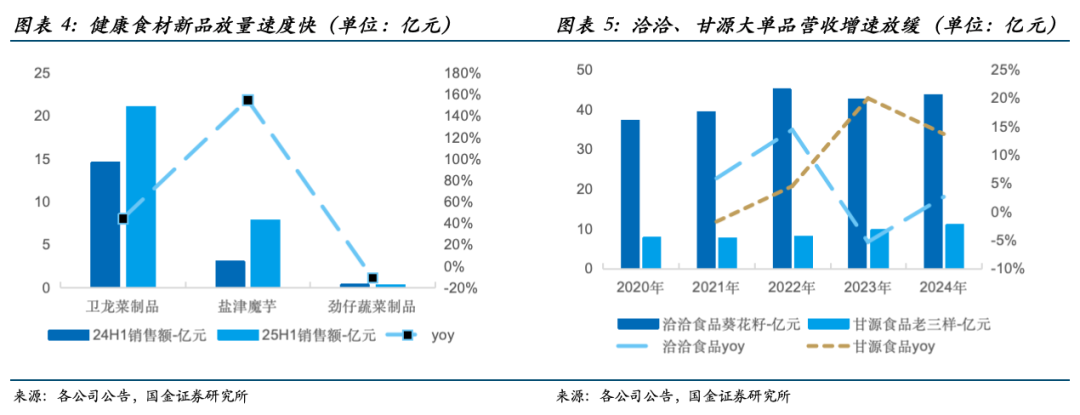 从产品表现来看,零食品类较多且竞争格局较为分散,各家主营产品错位竞争,上半年魔芋、鸭掌、鹌鹑蛋等品类仍呈现较强的增长势能。1)盐津魔芋/卫龙菜制品25H1分别实现营收7.9/21.1亿元,分别同比增长155%/44%。2)劲仔、洽洽大单品上半年收入表现相对稳健,但鹌鹑蛋、坚果等第二曲线表现不及预期,对整体造成拖累。