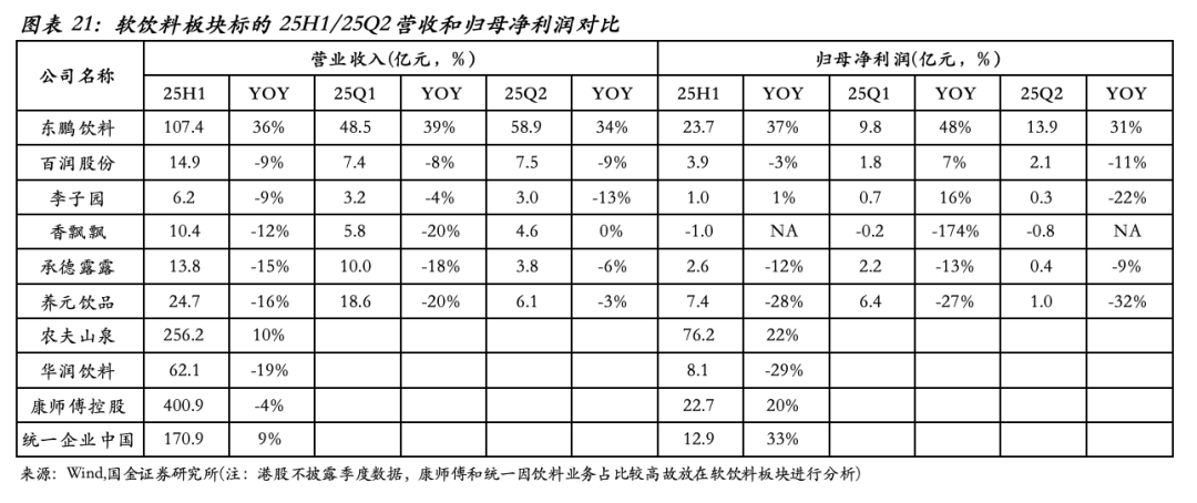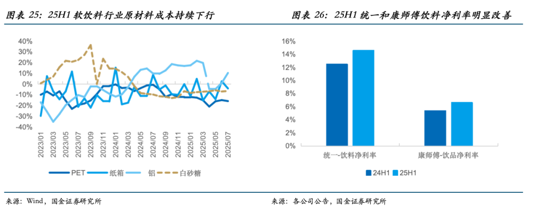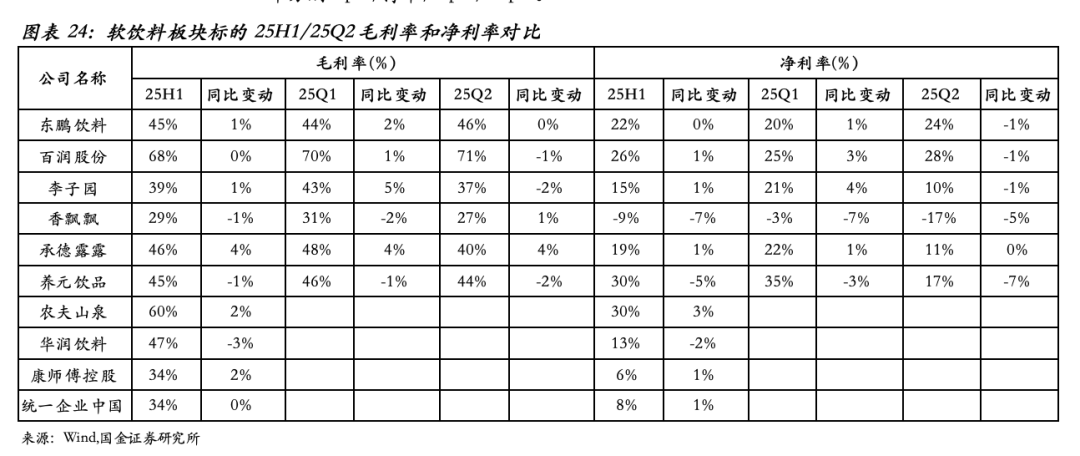 从成本端来看,随着占比较大的PET/白糖/纸箱等原材料价格持续下行,板块个股毛利率持续改善, 25H1农夫/康师傅/统一毛利率同比+2pct/+2pct/持平,其中农夫毛利率同比改善预计系绿水结构占比下降、茶饮业务规模效应体现、及原材料成本下降。受其他原材料及产品结构影响,仍有多数企业毛利率持平或略降,25Q2百润/东鹏/李子园/香飘飘毛利率分别-1pct/持平/-2pct/+1pct。