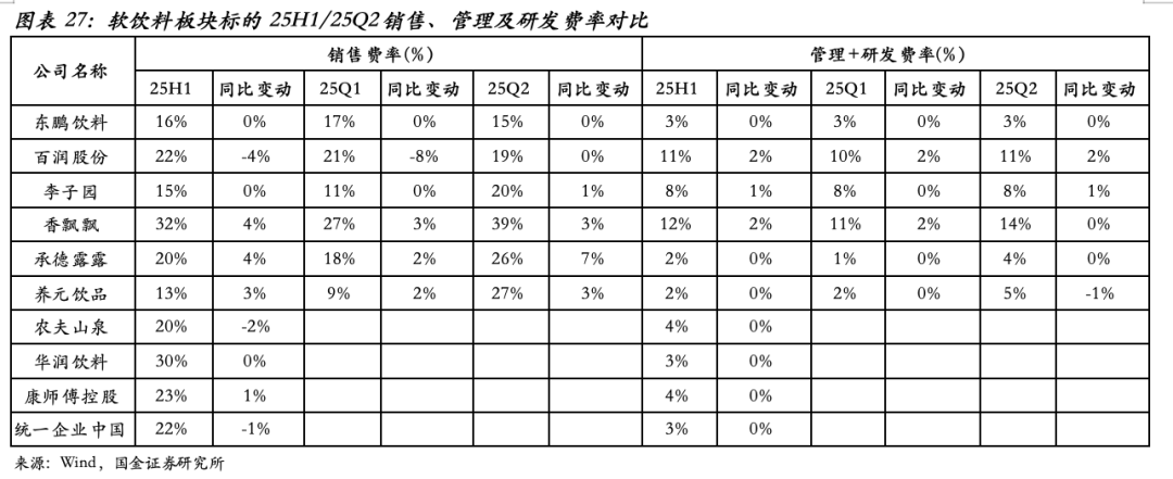 从费率端来看,淡季需求承压+市场竞争加剧,各家普遍强化费用投放,最终毛销差实现小幅提升。25Q2百润/东鹏/李子园/承德露露/养元饮品销售费率分别持平/持平/+1pct/+7pct/+3pct;管理及研发费率分别+2pct/持平/持平/持平/-1pct。农夫/康师傅/统一25H1销售费率分别-2pct/+1pct/-1pct,管理+研发费率均持平,农夫持续强化对于费用的管控,康师傅公司持续聚焦价盘修复,旺季适当加大促销投放,费率略有提升。