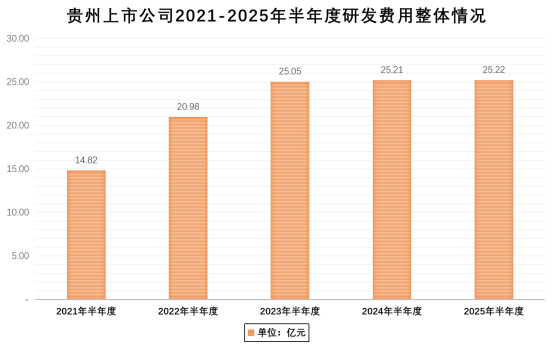 近年来,贵州上市公司持续加大科研投入,提升创新水平,2025年上半年,共有33家贵州上市公司披露研发投入情况,在研发费用方面总投入达25.22亿元,同比略增0.04%,较2021年半年度提升70.18%。研发投入超过1亿元的共有6家,其中,中伟股份以5.45亿元位居首位,航天电器3.31亿元、中航重机2.8亿元、盘江股份1.81亿元、贵州轮胎1.71亿元、振华科技1.49亿元。