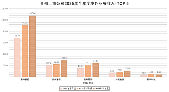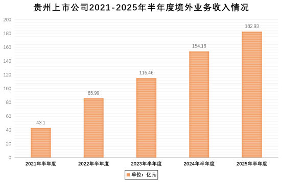 随着贵州上市公司产品不断创新突破,科技含量不断提升,海外市场持续巩固拓展,2025年上半年共有13家公司披露境外业务收入数据,总计实现收入182.93亿元,同比增长18.66%,参与公司数量和收入规模均创下新高。