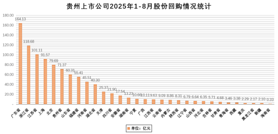 2025年1-8月,共有8家贵州上市公司积极通过股份回购向市场传递发展信心,切实维护投资者权益,累计投入金额达71.37亿元,位居全国第6位、西部第1位。