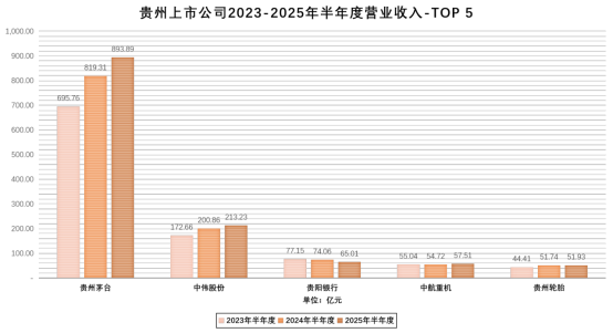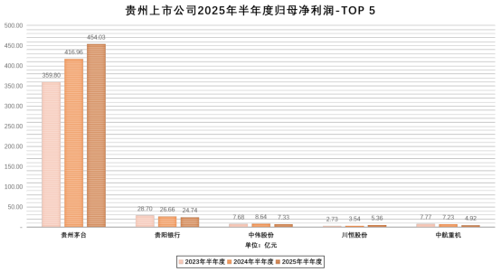 从个体情况看,25家公司实现盈利、占比71.43%,其中贵州茅台以454.03亿元位居首位,贵阳银行以24.74亿元次之。相比同期,1家企业转亏为盈。11家公司2025年上半年业绩同比增长,其中增幅超过100%的有2家、超30%的有5家、超10%的有9家。21家公司连续5年持续盈利,沃顿科技和贵航股份近三年均保持超10%的盈利增长。