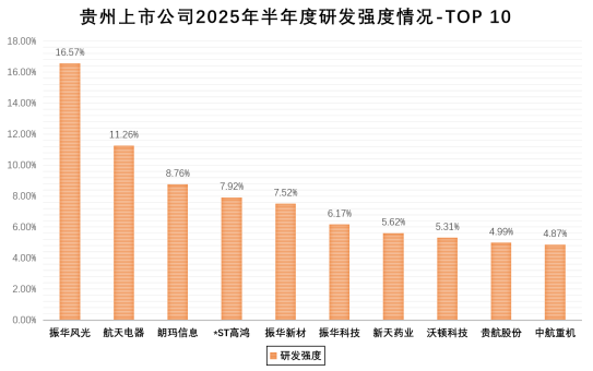 从具体情况来看,贵州共有24家公司的研发强度超过2.12%的全国均值、20家研发强度超3%、8家研发强度超5%,其中,振华风光以16.57%的研发强度位居首位。