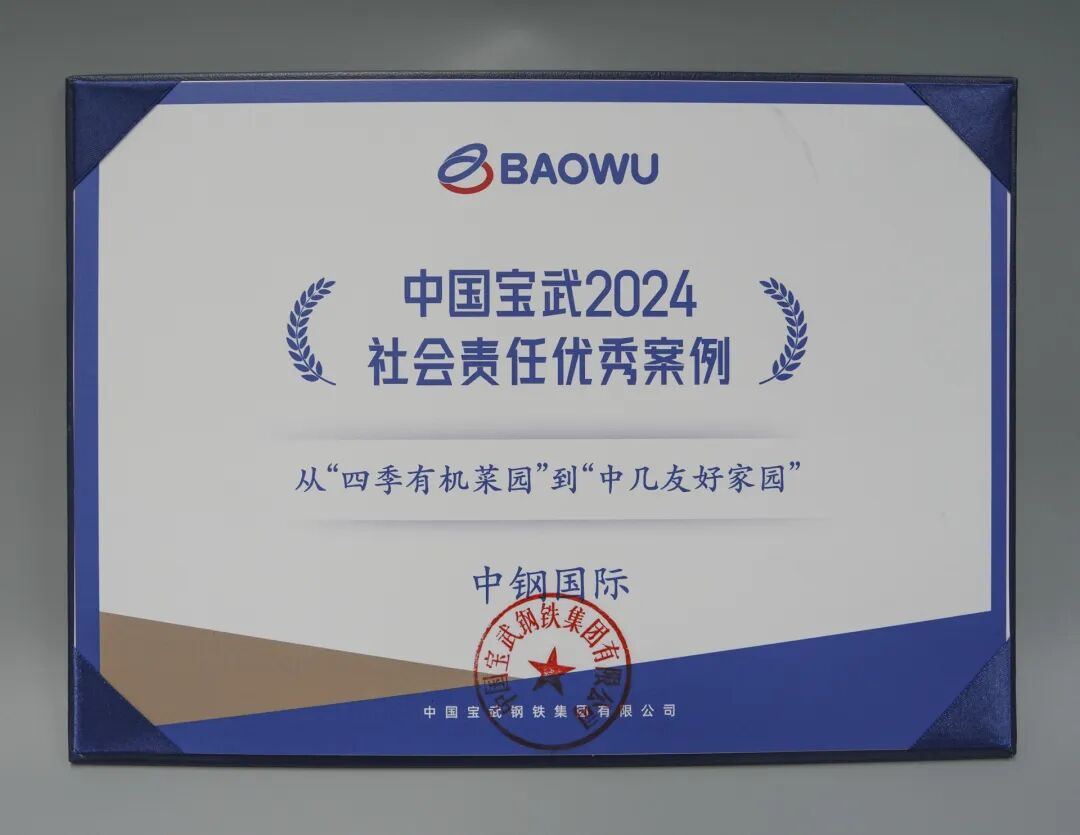 在发展进程中,中钢国际坚守"让工业更绿色、更智慧;让生活更美好、社会更繁荣"的使命,积极履行社会责任。在不久前举办的中国宝武2024年社会责任报告集中发布活动上,中钢国际凭借突出的责任实践斩获多项荣誉:第二届宝武社会责任先锋奖(集体)、第二届宝武社会责任先锋奖(个人—董事会办公室戚欣)、2024年度宝武社会责任优秀案例。