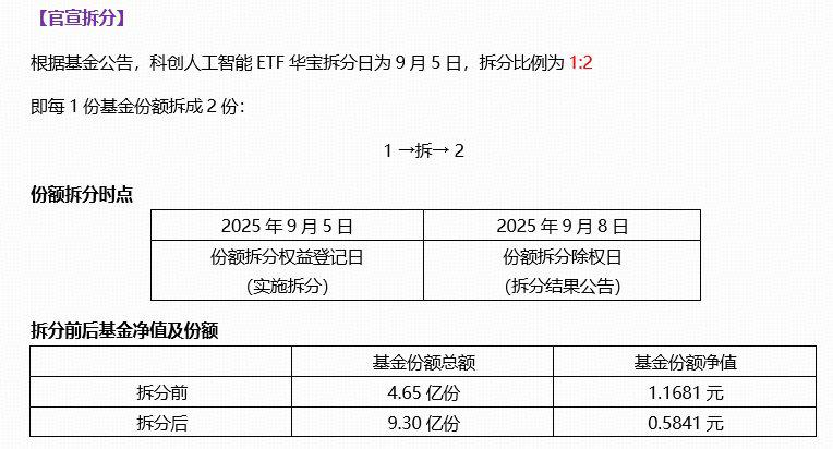 9月5日,科创人工智能ETF(589520)公告称,已按1:2的基金份额拆分比例,完成基金份额拆分。这意味着该ETF每1手的场内交易门槛由拆分前的约120元降至拆分后的约60元。ETF单位净值折半下降,大幅降低投资者交易门槛,便利更多投资者参与把握国产AI产业链的投资机遇。
