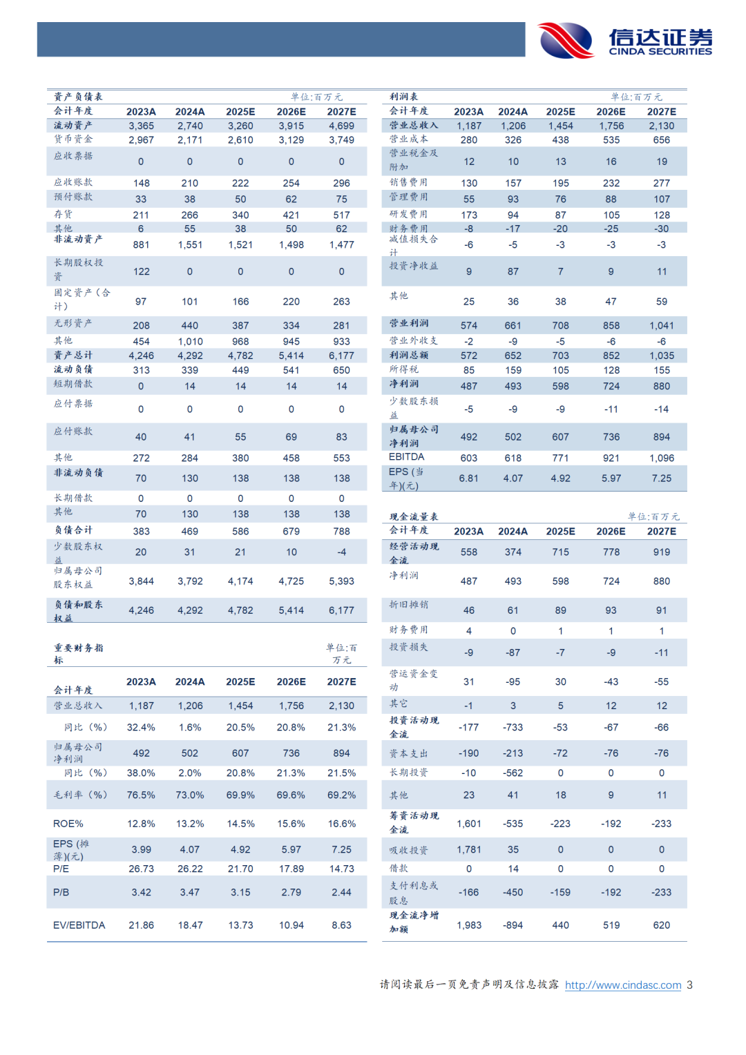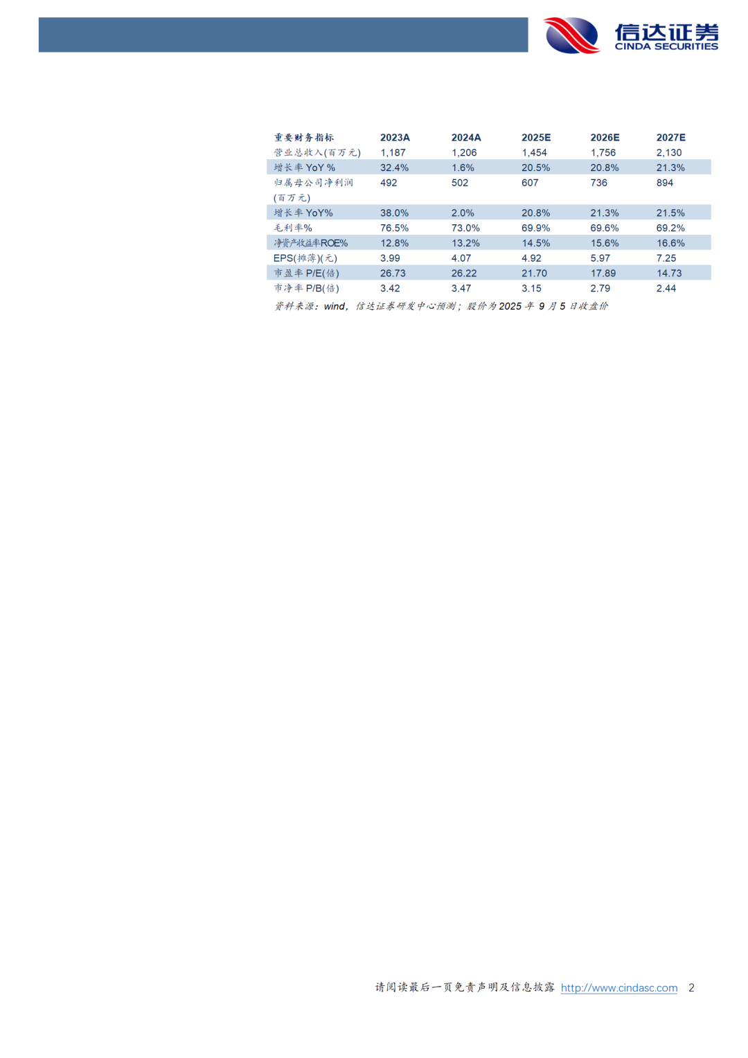 盈利预测:我们预计公司2025-2027年营业收入分别为14.54、17.56、21.30亿元,同比增速分别为20.5%、20.8%、21.3%,归母净利润分别为6.07、7.36、8.94亿元,同比增速分别为20.8%、21.3%、21.5%,对应2025年9月5日股价,PE分别为22、18、15倍。
