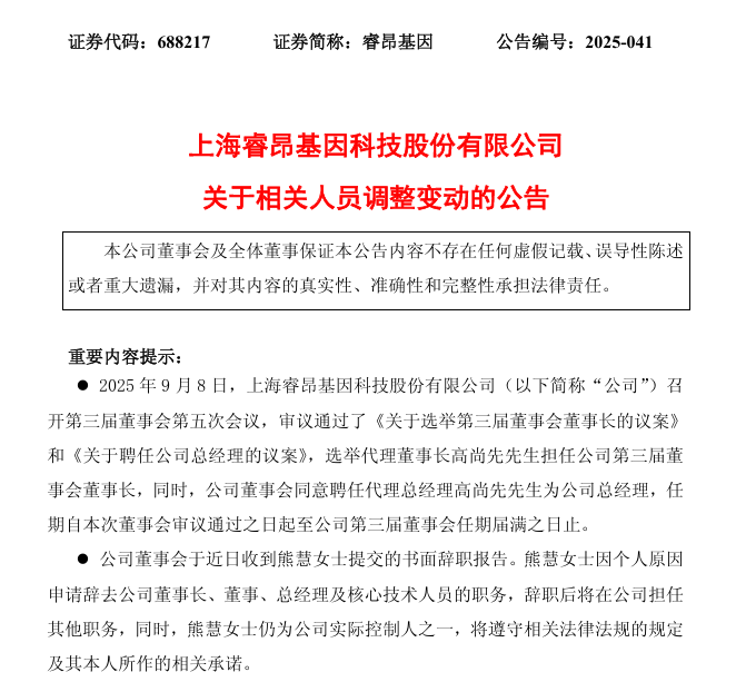 9月9日,“肿瘤检测龙头”睿昂基因公告,因个人原因,熊慧女士不再担任董事长、总经理、非独立董事及核心技术人员职务。