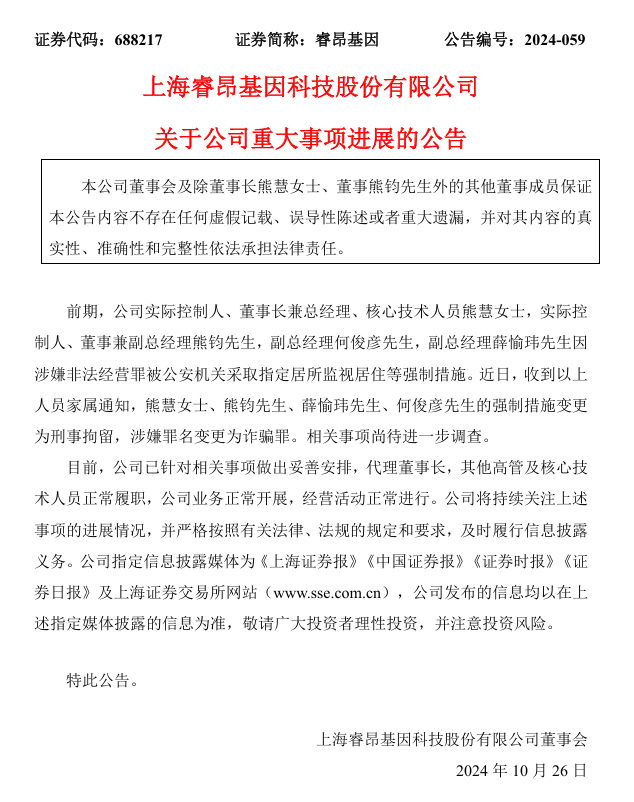 值得一提的是,2024年10月25日,睿昂基因公告称,公司实际控制人、董事长兼总经理、核心技术人员熊慧,实际控制人、董事兼副总经理熊钧,副总经理何俊彦,副总经理薛愉玮被采取的强制措施均转为刑事拘留,涉嫌罪名由非法经营罪变更为诈骗罪。