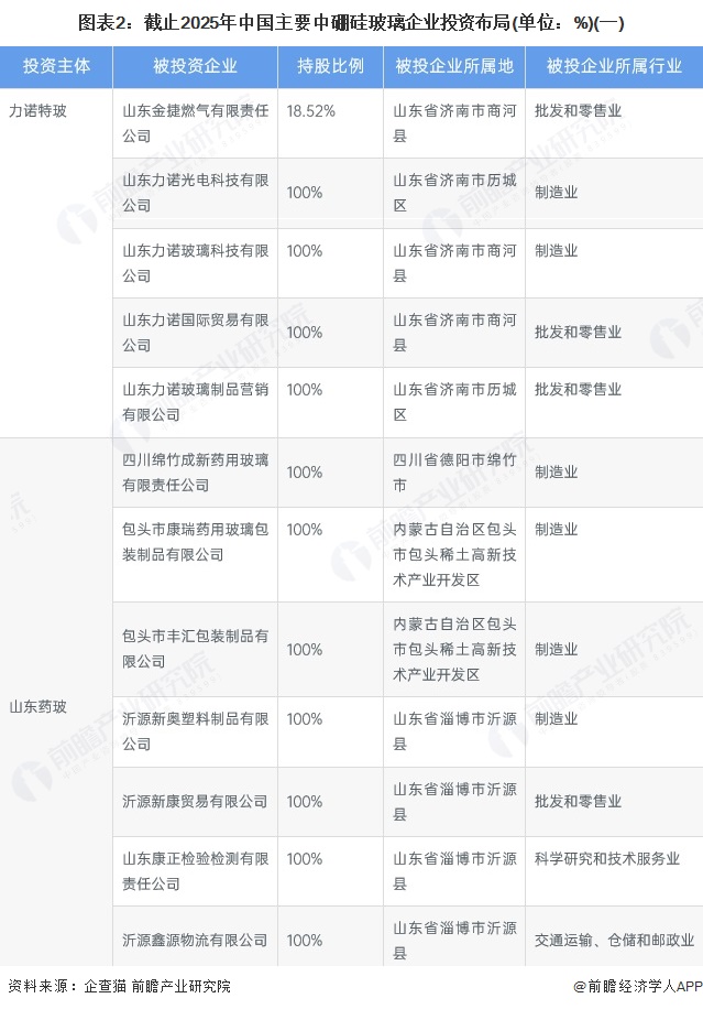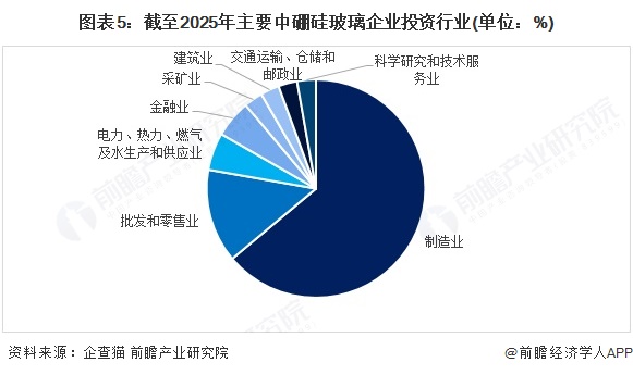 从中国主要中硼硅玻璃企业投资布局来看,制造业占比64%,批发和零售业占比14%,电力、热力、燃气及水生产和供应业占比5%,金融业占比5%。
