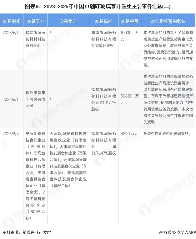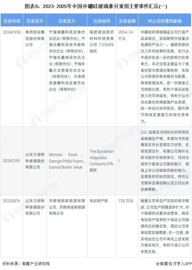 得益于《关于加快重点行业企业兼并重组的指导意见》等利好政策,近年来中国药用玻璃企业兼并重组频发,中国药用玻璃市场日益集中,以横向并购为主,2023- 2025年中国药用玻璃行业兼并与重组主要事件汇总如下: