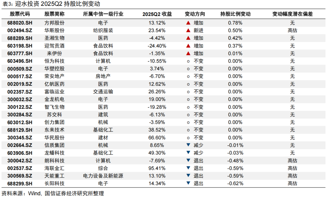 2025Q2迎水提高了方邦股份、华斯股份、圣湘生物、迎驾贡酒、来伊份的持股比例,并降低了长阳科技、天能重工、海联金汇、朗科科技、龙蟠科技等股票的持股比例。