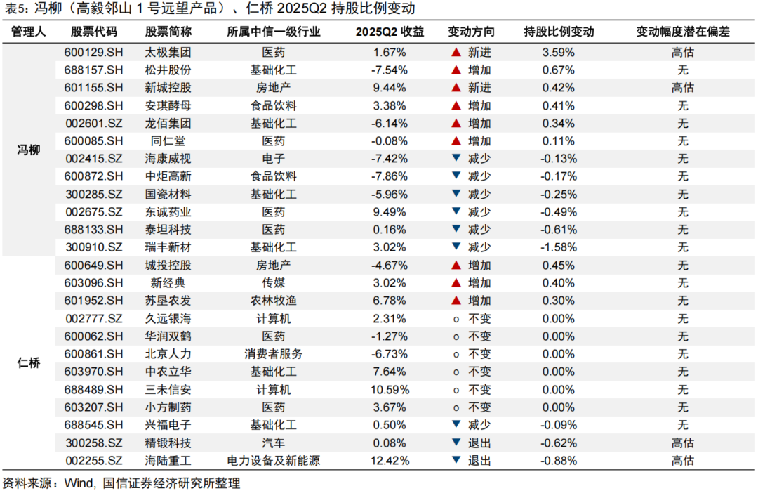 2025Q2冯柳(高毅邻山1号远望产品)提高了太极集团、松井股份、新城控股、安琪酵母、龙佰集团等股票的持股比例,并降低了瑞丰新材、泰坦科技、东诚药业、国瓷材料、中炬高新等股票的持股比例。