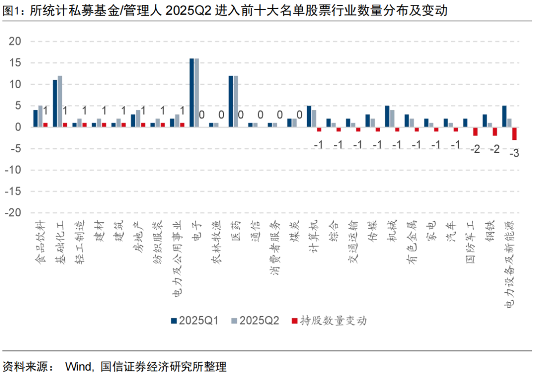 按中信一级行业划分,2025Q2电子、基础化工、医药行业中,参与统计的私募管理人进入前十大名单的股票数量最多,具体数量分别为16、12、12。相比于2025Q1,2025Q2私募管理人进入食品饮料、轻工制造、建材前十大名单的股票数量最多,从电力设备及新能源、国防军工、钢铁前十大名单撤离的私募管理人最多。