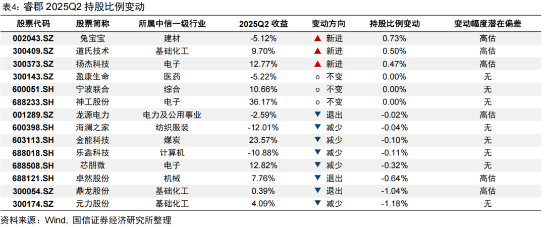 2025Q2睿郡提高了兔宝宝、道氏技术、扬杰科技的持股比例,并降低了元力股份、鼎龙股份、卓然股份、芯朋微、乐鑫科技等股票的持股比例。