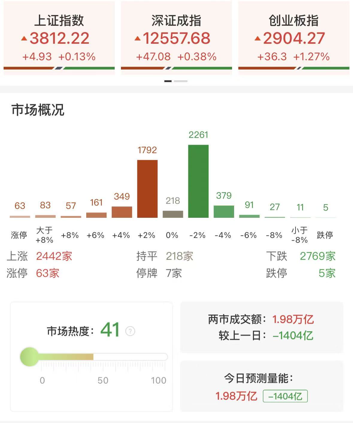 财联社9月10日讯,市场震荡拉升,三大指数盘中出现冲高回落后再反弹。沪深两市成交额1.98万亿,较上一个交易日缩量1404亿。盘面上,市场热点快速轮动,全市场上涨个股和下跌个股数量基本相当。从板块来看,算力硬件板块再度活跃,淳中科技两连板,工业富联涨停。油气板块全天走强,准油股份涨停。影视院线板块爆发,金逸影视涨停。下跌方面,电池板块走势疲软,领湃科技大跌。截至收盘,沪指涨0.13%,深成指涨0.38%,创业板指涨1.27%。