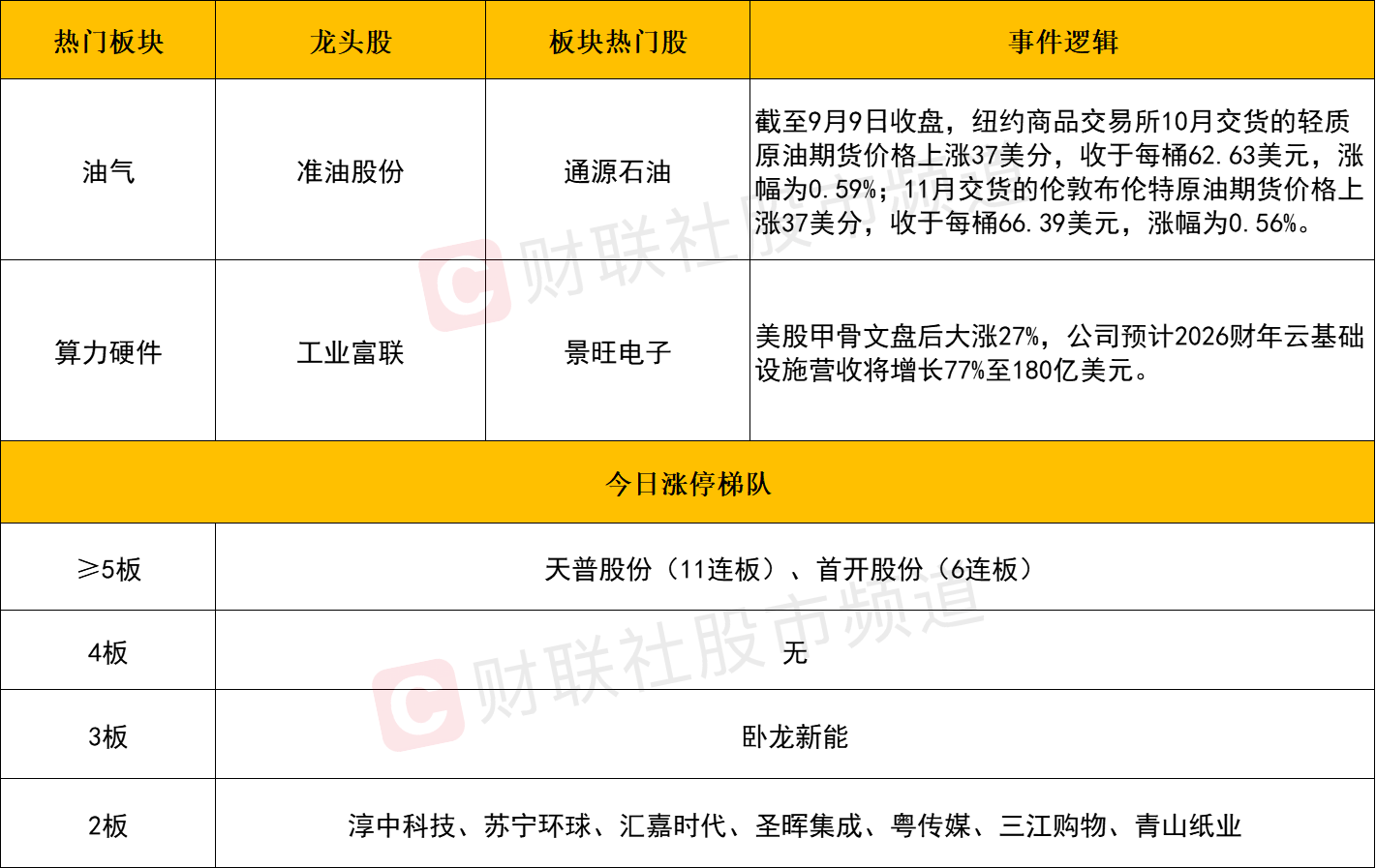油气板块同样走强,准油股份涨停,通源石油、惠博普、中曼石油、贝肯能源等个股涨幅居前。消息面上,截至9月9日收盘,纽约商品交易所10月交货的轻质原油期货价格上涨37美分,收于每桶62.63美元,涨幅为0.59%;11月交货的伦敦布伦特原油期货价格上涨37美分,收于每桶66.39美元,涨幅为0.56%。