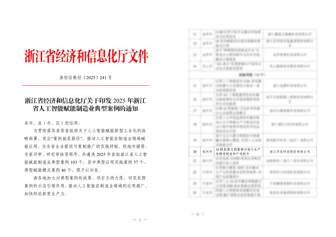 日前,浙江省经信厅发布了《2025年首批人工智能赋能制造业典型案例》,深入贯彻省委、省政府关于人工智能赋能新型工业化的战略部署,落实“案例就是路径”的推广理念,助力人工智能技术在制造业深度应用与复制推广。经严格评审,华是科技“AI赋能激光测量推动翅片生产线精准制造和产线跃迁”成功入选装备领域典型应用实践案例。