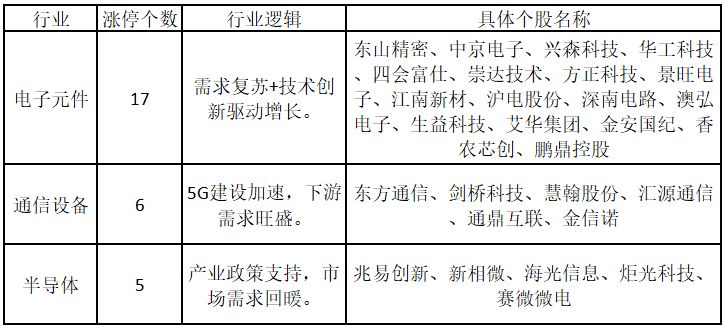 从行业特征来看,周四涨停板个股中,电子元件、通信设备、半导体行业的个股最多。