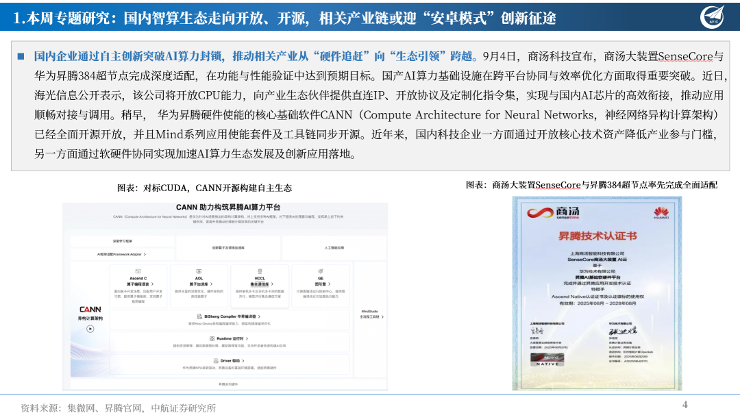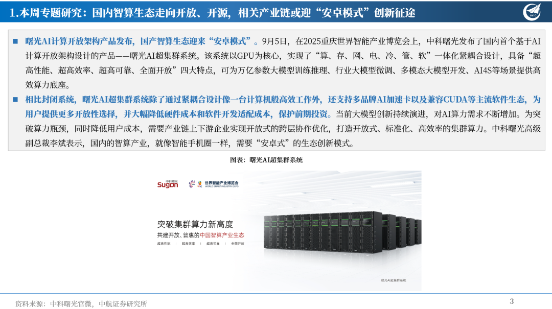 9月5日,国内首个基于AI计算开放架构设计的产品(曙光AI超集群系统)正式发布。相比封闭系统,开放架构设计支持多品牌AI加速卡以及兼容CUDA等主流软件生态,可以为用户提供更多开放性选择,并大幅降低硬件成本和软件开发适配成本。同时,商汤大装置SenseCore与华为昇腾384超节点完成深度适配,国产AI算力基础设施在跨平台协同与效率优化方面取得重要突破;海光信息公开表示将开放CPU能力,向产业生态伙伴提供直连IP、开放协议及定制化指令集,实现与国内AI芯片的高效衔接; 华为昇腾硬件使能的核心基础软件CANN全面开源开放,Mind系列应用使能套件及工具链同步开源,推动AI产业从“硬件追赶”向“生态引领”跨越。当前,国内科技企业一方面通过开放核心技术降低产业参与门槛,另一方面通过软硬件协同实现加速AI算力生态发展及创新应用落地。据悉,工业和信息化部将持续发力,加强与相关部门协同,从多个方面推动算力产业发展。中国电信研究院战略发展研究所所长饶少阳预计,到2035年,人工智能对我国GDP的贡献将超过11万亿元,或将带动十倍甚至百倍的算力需求增长。 建议关注:寒武纪、海光信息、中科曙光、软通动力、神州数码等。
