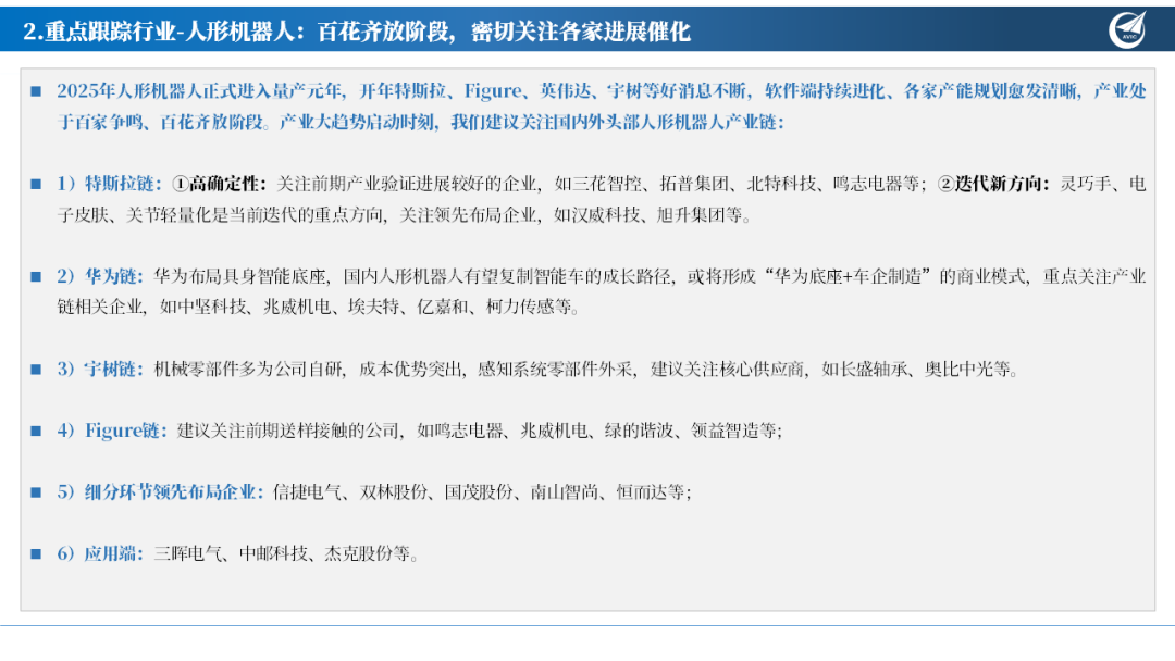 人形机器人:产业趋势明确,至2030年全球累计需求量有望达约200万台,目前进入从0到1的重要突破阶段,看好Tier1及核心零部件供应商。光伏设备:N型渗透率加速提升,马太效应下头部企业竞争力进一步强化,看好平台型布局电池片、组件的龙头公司。储能:储能是构建新型电网的必备基础,政策利好落地,发电、用户侧推动行业景气度提升,看好电池、逆变器、集成等环节龙头公司。半导体设备:预计2030年行业需求达1400亿美元,中国大陆占比提高但国产化率仍低,看好平台型公司和国产替代有望快速突破的环节。自动化:下游应用领域广泛的工业耗材,市场规模在400亿左右,预计2026年达557亿元,看好受益于集中度提高和进口替代的行业龙头。氢能源:绿氢符合碳中和要求,光伏和风电快速发展为光伏制氢和风电制氢奠定基础,看好具备绿氢产业链一体化优势的龙头公司。工程机械:强者恒强,建议关注行业龙头,看好具备产品、规模和成本优势的整机和零部件公司。