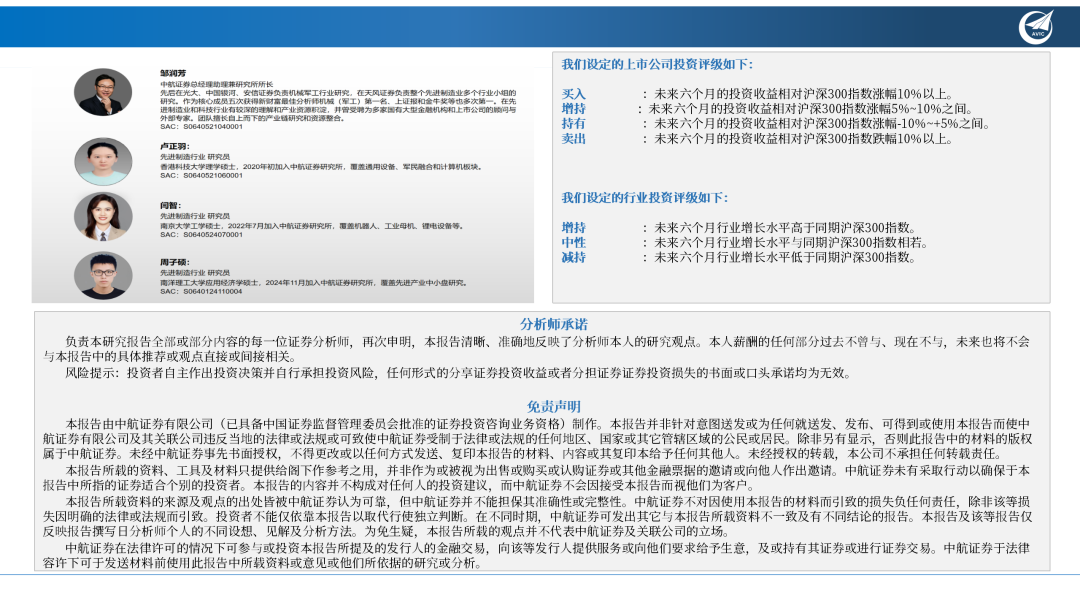 闫智:先进制造研究员。南京大学工学硕士,2022年7月加入中航证券,覆盖工业母机、机器人、激光设备、锂电设备。SAC执业证书:S0640524070001。