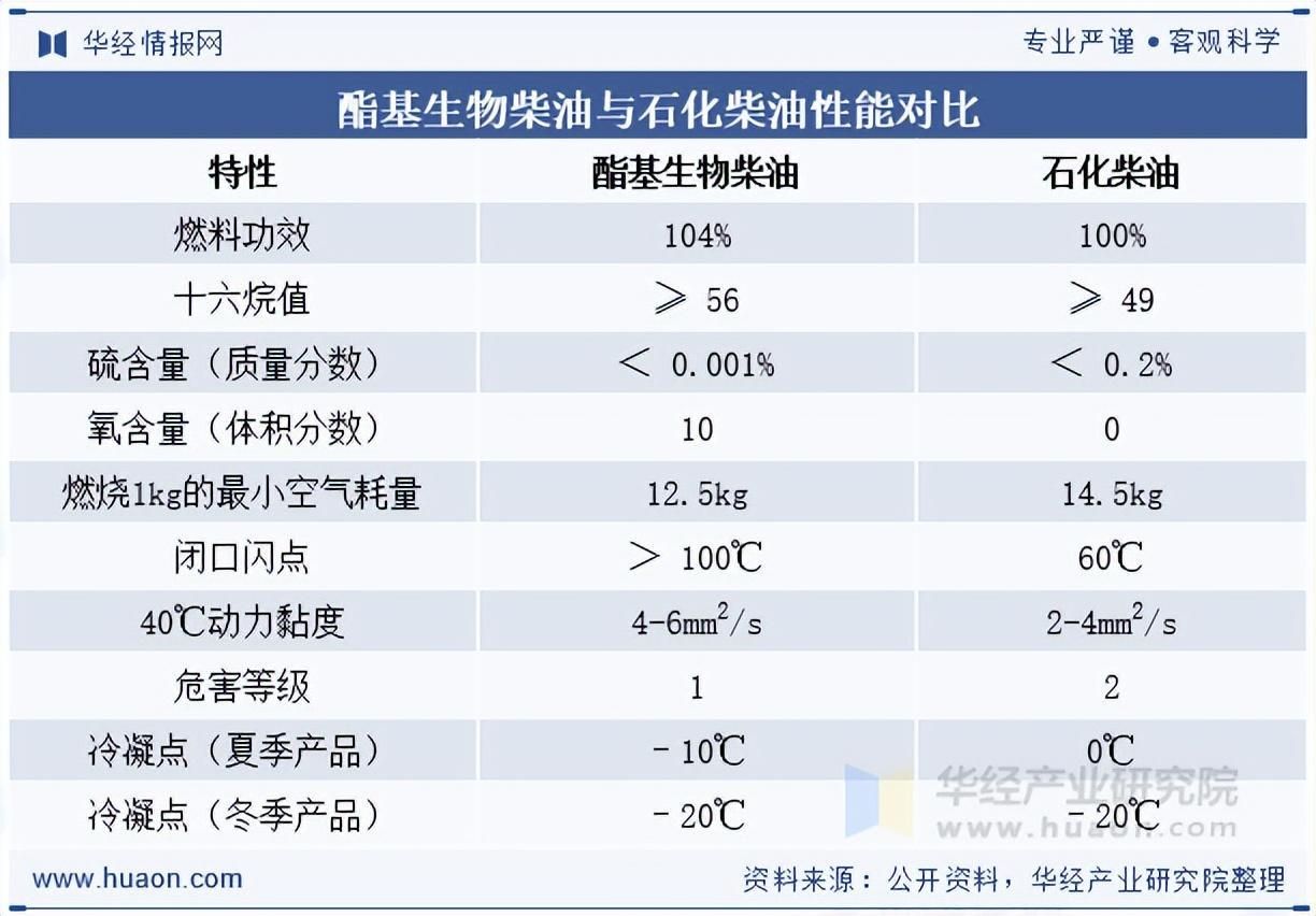 生物柴油绿色清洁,是优质的石化燃料替代品。对比石化燃料和最广泛应用的酯基生物柴油,酯基生物柴油具有清洁环保、黏度大、氧含量高、闪点高及易降解等优点。