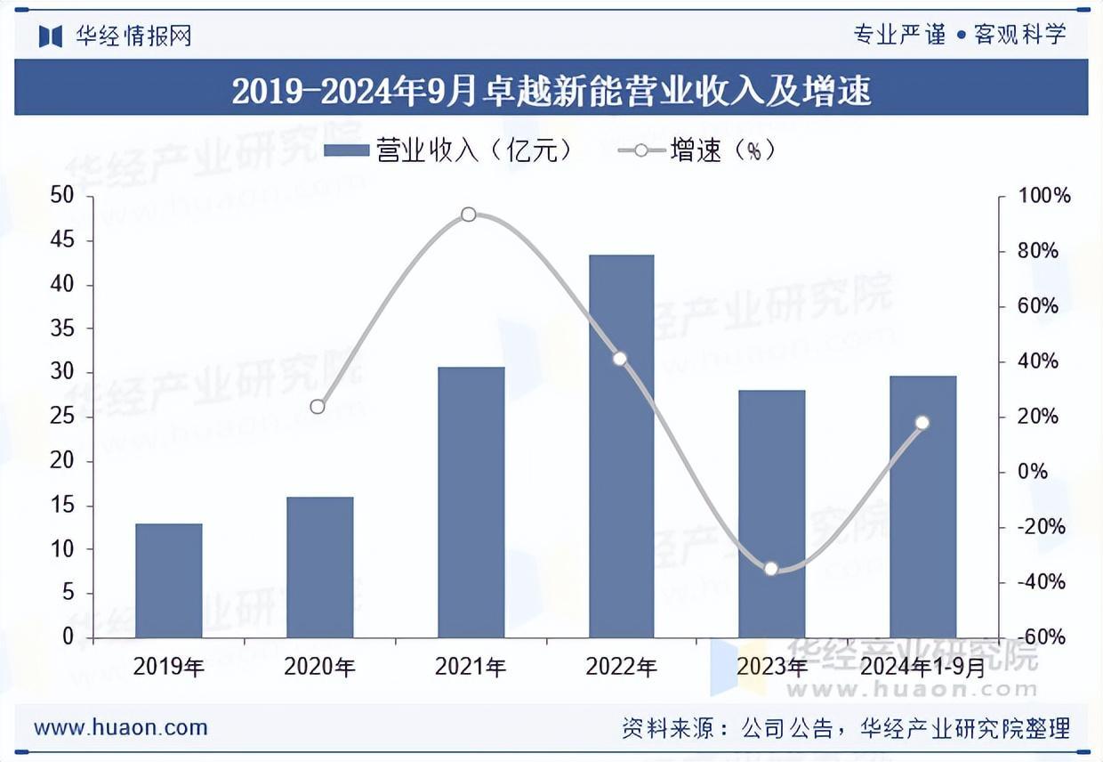 龙岩卓越新能源股份有限公司国内酯基生物柴油龙头,生物质能化一体化布局。卓越新能是国内第一家从事废弃油脂制备生物柴油的技术研发并率先实现工业化生产的企业,也是目前国内产销量和出口量最大的生物柴油生产企业,并逐步形成以生物柴油为主,衍生深加工生物基材料的“生物质能化一体化”的产业布局。营收方面,2019-2022年公司营业收入持续增长,2023年受到欧盟对华生物柴油启动多项贸易摩擦调查影响,公司生物柴油产品售价下降导致营收骤减,2023年公司营业总收入同比缩减35.28%,2024年1-9月,公司收入达到29.74亿元,同比增长17.18%。