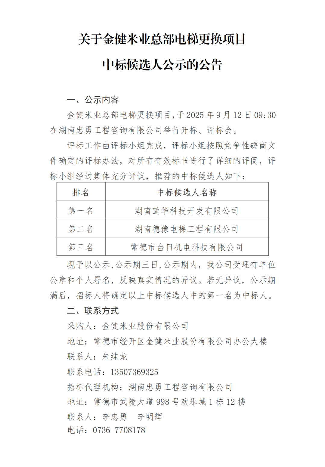 关于金健米业总部电梯更换项目中标候选人公示的公告