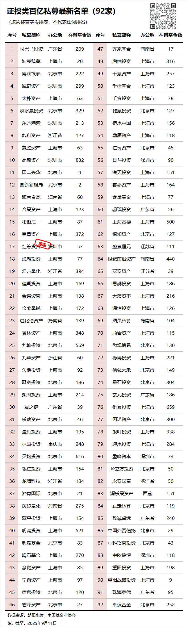 截至9月12日,国内证投类百亿私募共计92家,较上月中旬我们的统计时净增加1家:
