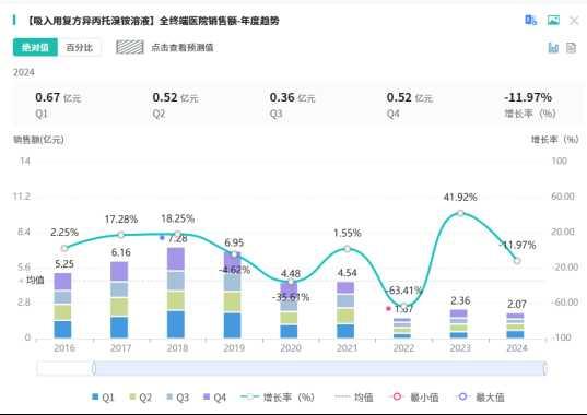 吸入用复方异丙托溴铵溶液由勃林格殷格翰开发,该药品是《国家基本医疗保险、工伤保险和生育保险药品目录(2024年版)》乙类药品,适用需要多种支气管扩张剂联合应用的患者,用于治疗气道阻塞性疾病有关的可逆性支气管痉挛。据摩熵医药数据库显示,吸入用复方异丙托溴铵溶液在2024年全终端医院销售额超2亿元。