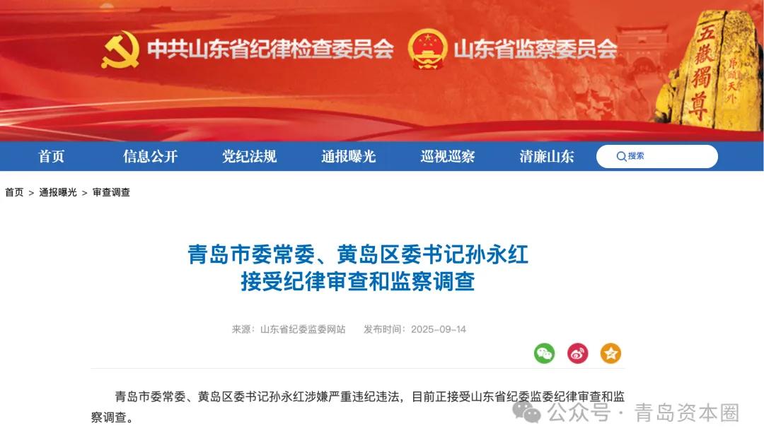 《青岛资本圈》关注到,中央纪委国家监委网站9月14日援引山东省纪委监委消息通报,青岛市委常委、黄岛区委书记孙永红涉嫌严重违纪违法,目前正接受山东省纪委监委纪律审查和监察调查。
