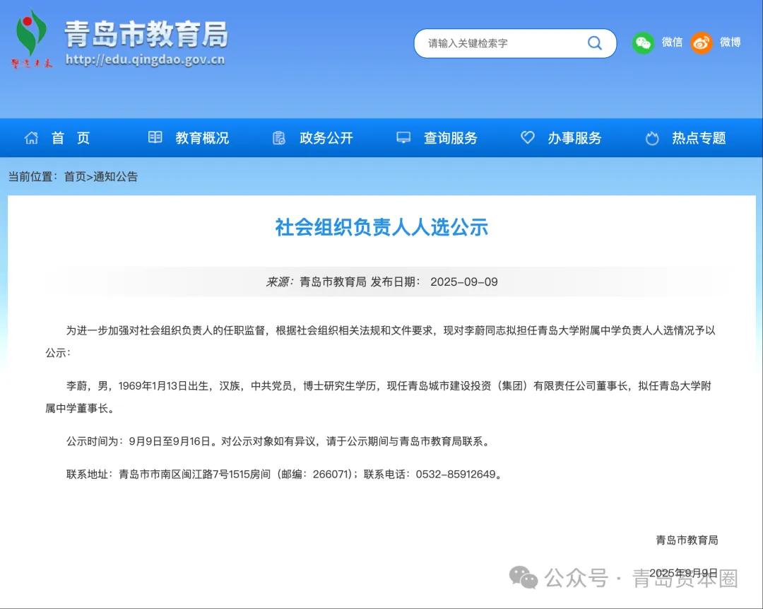 日前,青岛市教育局发布社会组织负责人人选公示,青岛城市建设投资(集团)有限责任公司董事长李蔚,拟兼任青岛大学附属中学董事长。