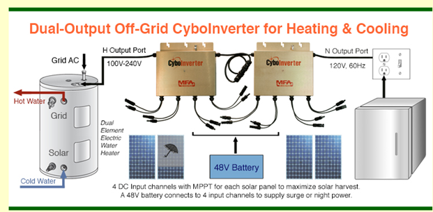 CyboInverter提供并网、离网、并网/离网、双输出离网和交流辅助离网功能 。CyboEnergy 独特的专利无电池离网 CyboInverters 用于电热水器、光伏空调和交流辅助离网,可以帮助解决电网“鸭子曲线”问题并改变太阳能行业的格局。