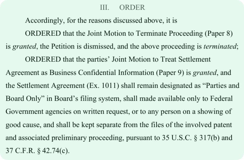 依据《美国法典》第 35 编第 317 (b) 条及《联邦法规汇编》第 37 编第 42.74 (c) 条,和解协议(附件 1011)在委员会的文件系统中,应继续标注为 “仅限当事人与委员会查阅”;仅应联邦政府机构的书面请求提供该协议,或在任何人证明存在正当理由的情况下提供;且该协议应与所涉专利的档案及相关初步程序档案分开存放。