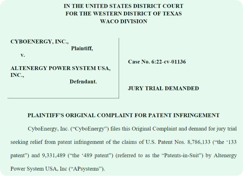 根据起诉状的内容显示,CyboEnergy是特拉华州的一家公司,其主要营业地位于加利福尼亚州的萨克拉门托,CyboEnergy 是世界上第一个太阳能微型逆变器CyboInverter 的开发商,具有中央逆变器和微型逆变器的关键优点。