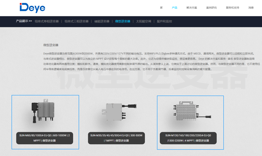 根据德业网站介绍:Deye微型逆变器功率范围从300W到2000W,并具有220V/230V/127V不同的输出电压。支持WIFI/PLC/Zigbee多种通讯方式。由于 MECD,通信网关,微型逆变器可以远程和立即关闭。与串式逆变器相比,微型逆变器可以为独立的 MPPT 设计获取每个面板的最大功率。此外,它还为您提供模块级监控,使运维更容易。