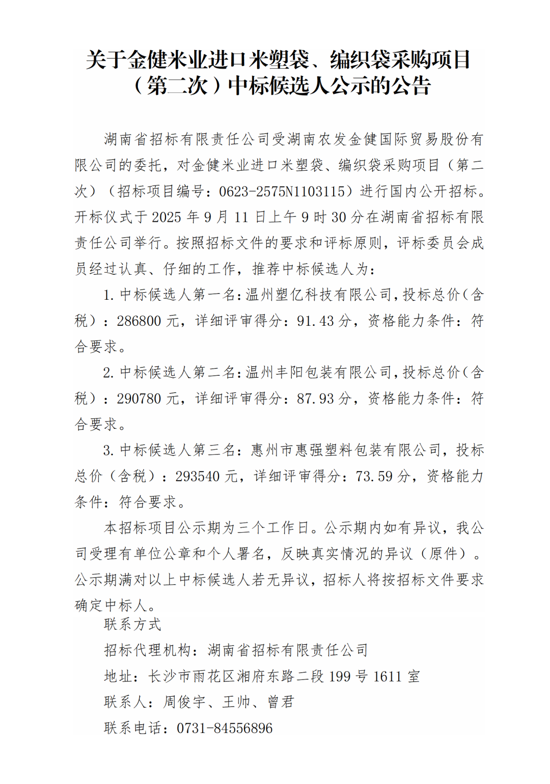 关于金健米业进口米塑袋、编织袋采购项目(第二次)中标候选人公示的公告