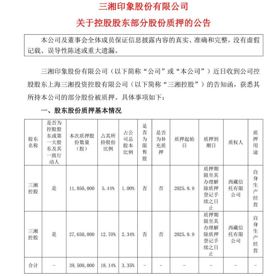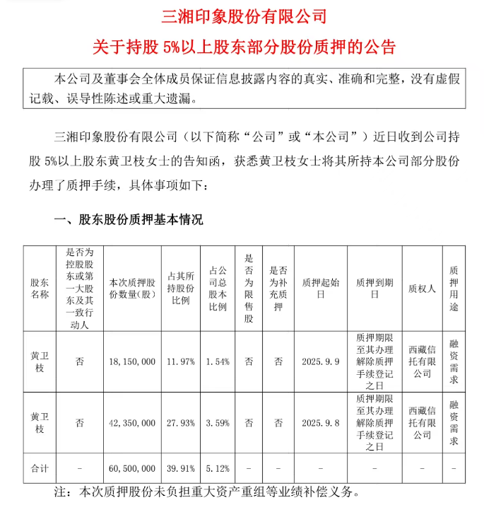 此外,9月11日,三湘印象股份有限公司发布公告称,近日收到公司持股5%以上股东黄卫枝女士的告知函,获悉黄卫枝女士将其所持本公司部分股份办理了质押手续,将合计6050万股质押给西藏信托,质押用途为融资需求。