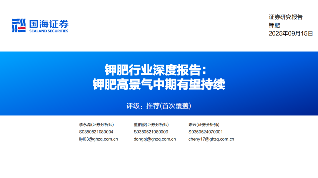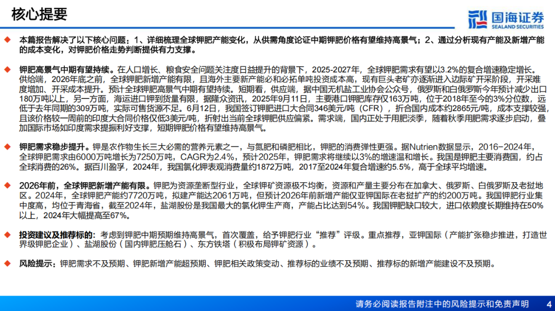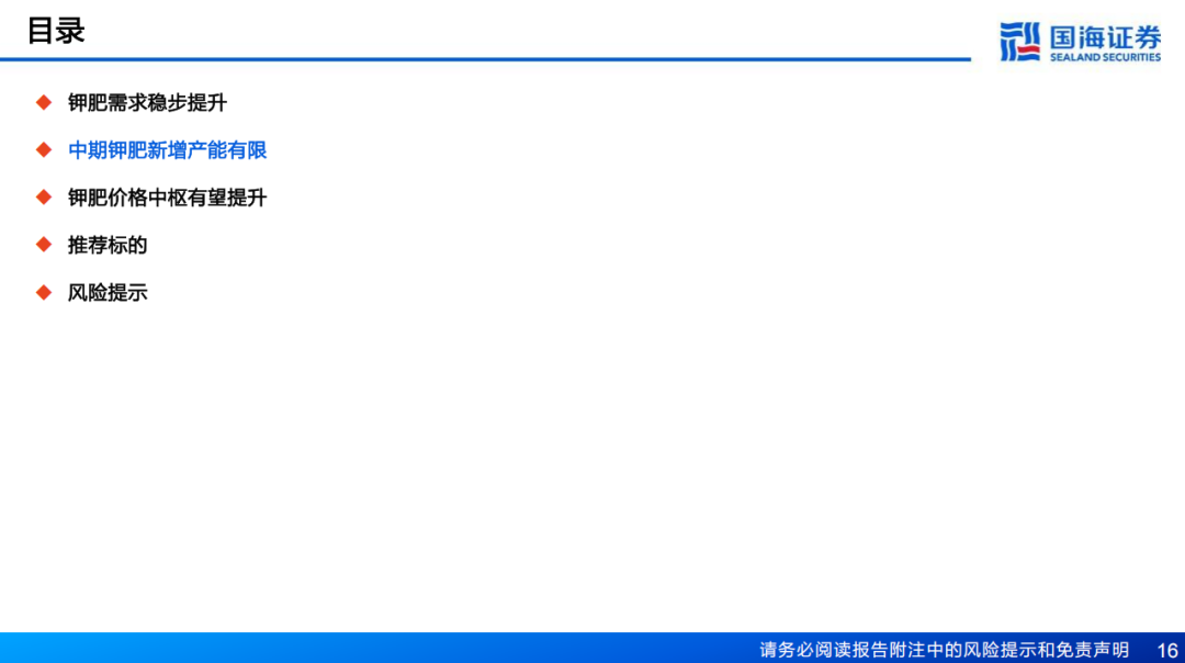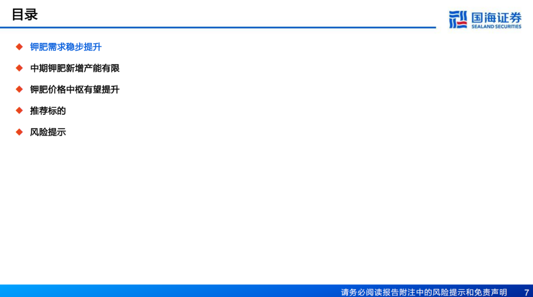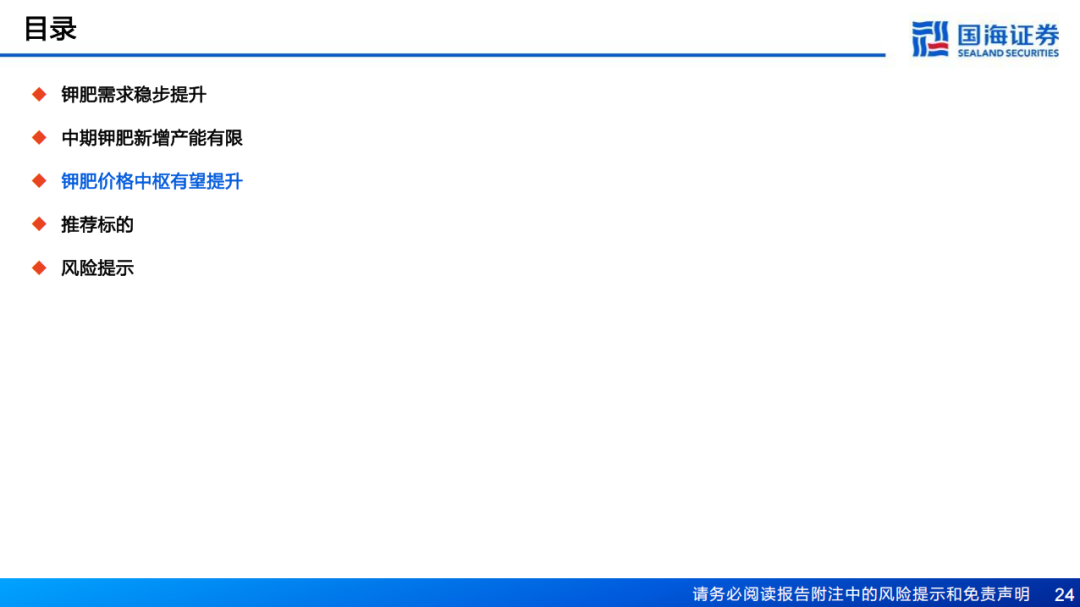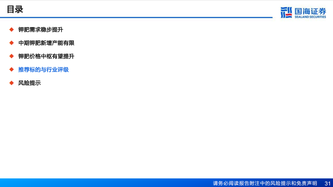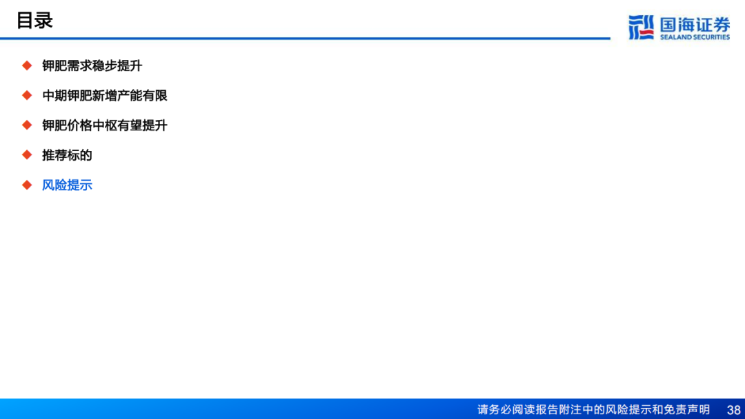 风险提示:钾肥需求不及预期、钾肥新增产能超预期、钾肥相关政策变动、推荐标的业绩不及预期、推荐标的新增产能建设不及预期。